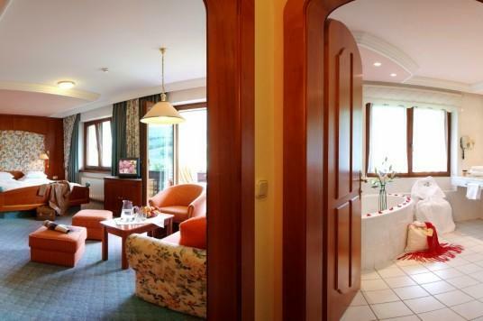 Junior Suite C – 42 qm, 2 dospělí, ložnice, výklenek s patrovou postelí, sprcha, WC odděleně, fén na vlasy, TV, telefon, tresor, župan, minibar, částečně balkón.
